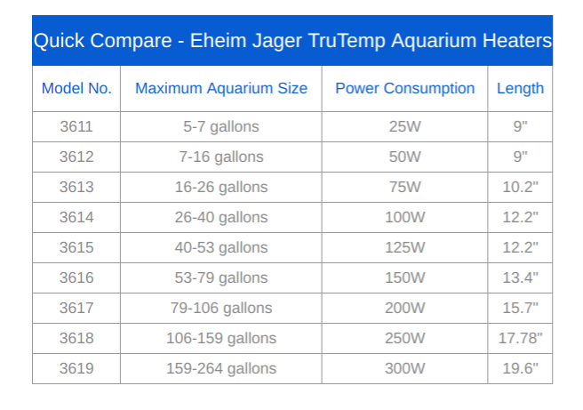 Eheim jager heater sizes.